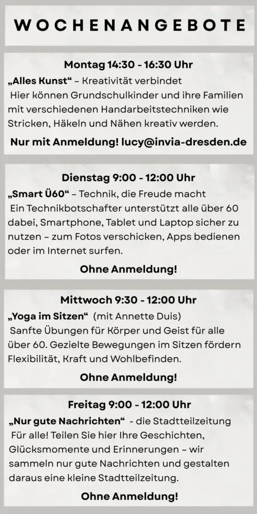 IN VIA Dresden e.V. erhielt über Aktion Mensch eine Förderung zur Entwicklung einer Projektidee zusammen mit Kindern und Jugendlichen für ein längerfristiges Hauptprojekt ab 2026. Dabei soll es nicht nur um Empowerment und Stärkung des sozialen Engagements gehen, sondern ganz klar auch um das Aufklären und Aufdecken von Zugangsbarrieren im weitesten Sinne. Dabei denken wir nicht nur an Menschen mit seelischen und körperlichen Beeinträchtigungen. Barrieren können auch durch die ökonomische Situation, Sprache, Alter oder äußere Merkmale entstehen. So gibt es z.B. Orte an denen Kinder nicht willkommen sind, Orte, die sich nicht alle leisten können oder Situationen, wo Menschen mit bestimmten äußeren Merkmalen Vor- oder Nachteile haben. Ganz schön komplex, wenn man tiefer darüber nachdenkt. Wir wollen dafür nicht nur den Blick schärfen und Öffentlichkeit herstellen, sondern zusammen mit Kindern und Jugendlichen konkrete Impulse für eine inklusive Gestaltung des Sozialraums und für eine inklusive Stadtentwicklung geben.