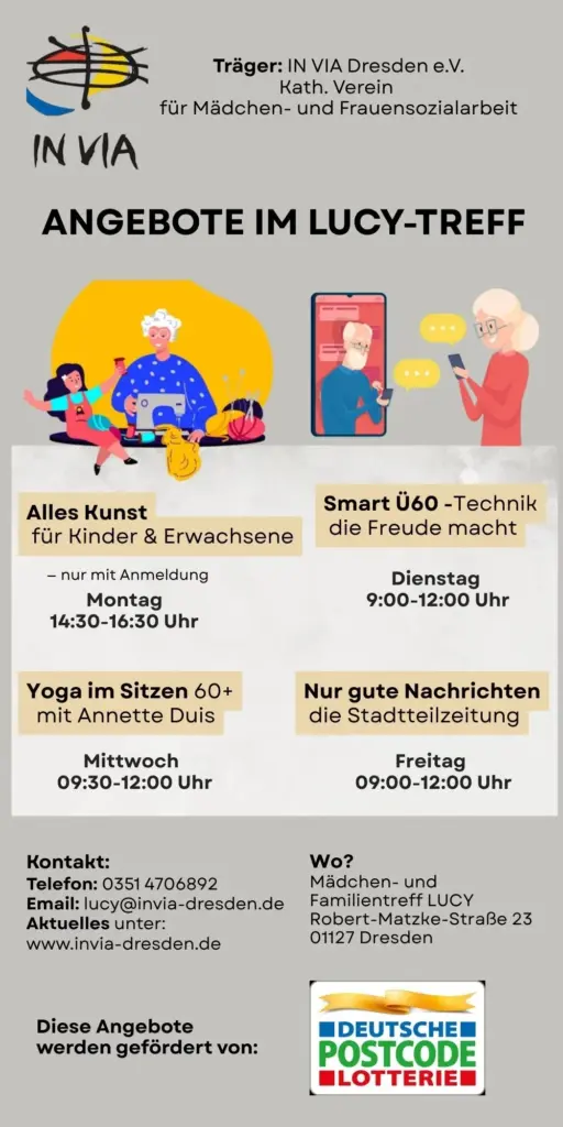 Die Deutsche Postcode Lotterie unterstützt IN VIA Dresden e.V. für das Jahresprojekt Ich+Du=Wir!! im Mädchen- und Familientreff LUCY mit 76.800 Euro! Diese Förderung ermöglicht uns bis Ende März 2026 unsere Räume weiter offen zu halten und großen und kleinen, jungen wie älteren Besucher*innen an drei Tagen zusätzlich einen Ort der Begegnung und Bildung zu geben.
